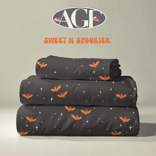 Sweet n Spookier, Halloween Bat Fabric, Orange Bats on Black Cotton - Art Gallery Fabrics