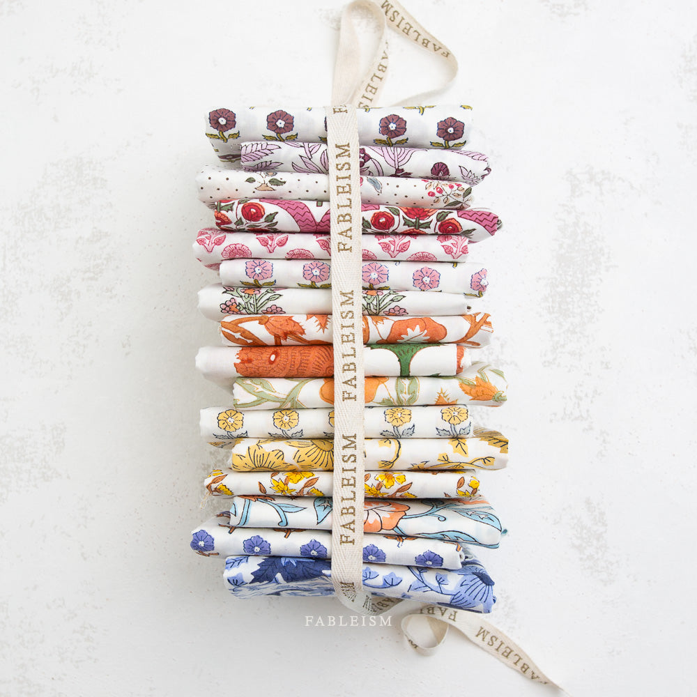 Celebrate the artistry of Indian craftsmanship with this exquisite fat quarter bundle, featuring the full Cottage collection — Fableism’s first-ever line of artisan block-printed fabrics created in India. Each print is hand-stamped using traditional methods and then recolored for a modern, updated take on heritage designs.