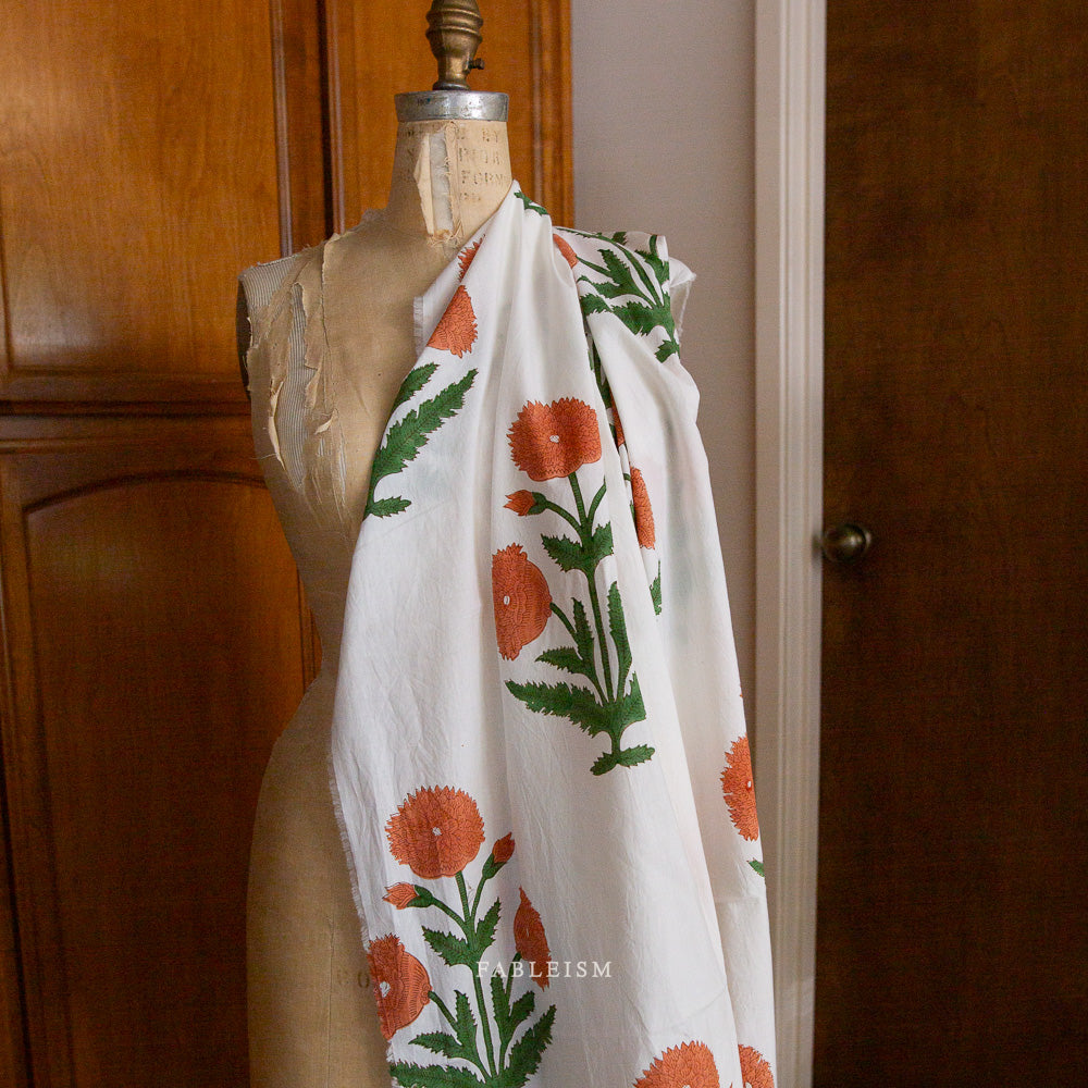 Meet the fabric that blends heritage artistry with modern design. This beautiful print features bold sienna-orange florals and leafy green stems hand block printed by artisans in India, exclusively for Fableism. Inspired by traditional Indian motifs, each piece has been recolored and reimagined for a fresh, cottage-core aesthetic that feels both timeless and new.
